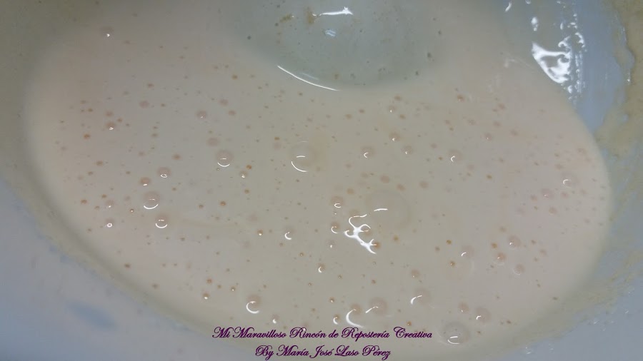 En el bol de la batidora, ponemos las yemas con la mitad del azúcar y batimos hasta que doble su volumen.