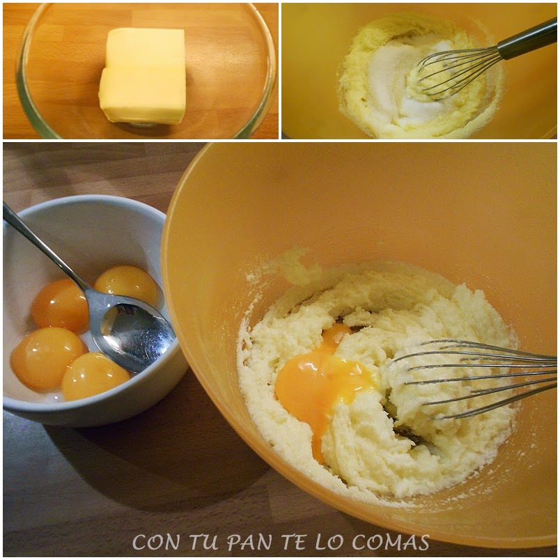 Ablandar la mantequilla (125 gr.) sin llegar a licuar. Mezclar con el azúcar (250 gr.) y batir vigorosamente. Incorporar las yemas (5 huevos) de una en una. Añadir la harina (500 gr.) en forma de lluvia y mezclar. Por último incorporar las claras montadas. Llevar al horno a temperatura media y dejar 25-30 minutos.