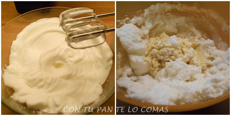 5. Luego se montan las claras a punto de nieve y se incorporan suavemente (anda que si llego a poner el medio kilazo de harina...) Pensar que no van a bajar es absurdo, así que a mezclar se ha dicho con todo el cuidado posible.