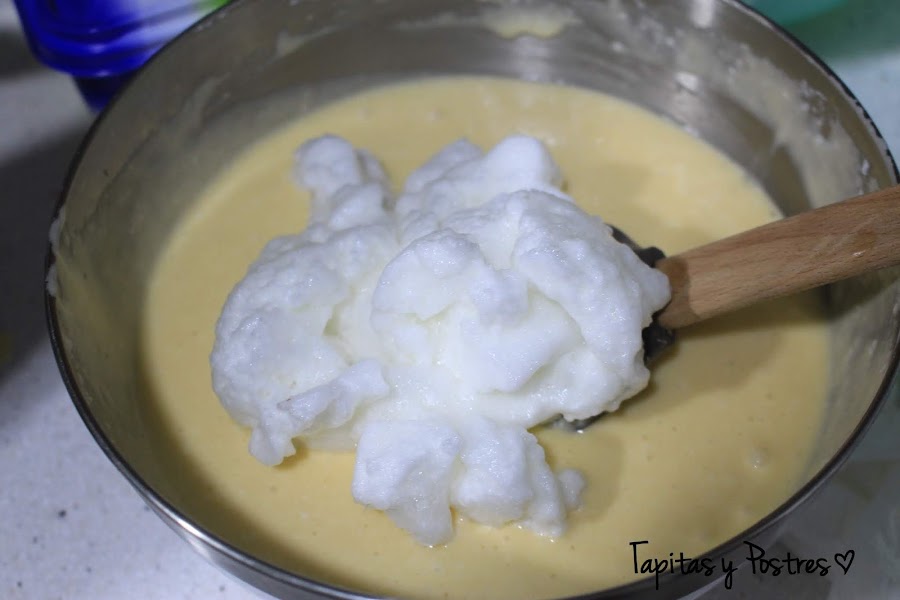 Sacamos la masa y la ponemos en un recipiente amplio. Agregamos poco a poco las claras montadas y vamos mezclando hasta integrarlo todo bien.