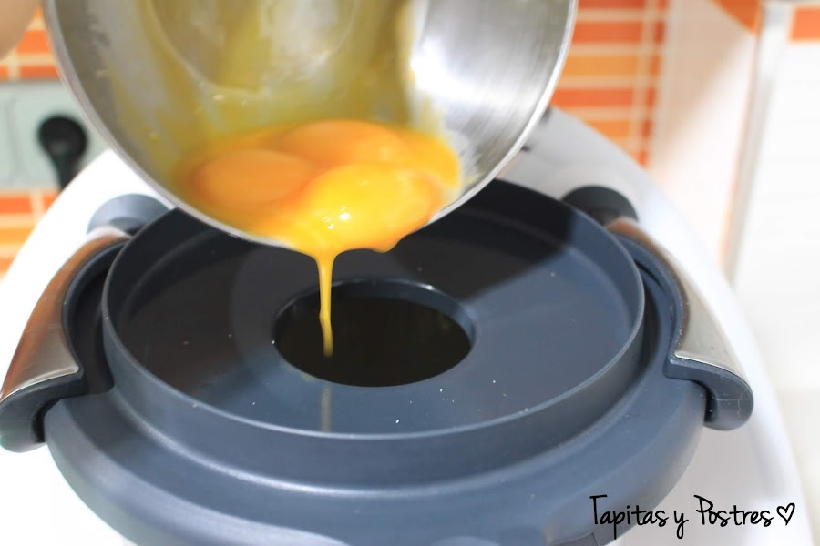 Ahora ponemos la máquina en marcha a velocidad 3 y vamos añadiendo las yemas una a una batiendo bien antes de echar la siguiente.
