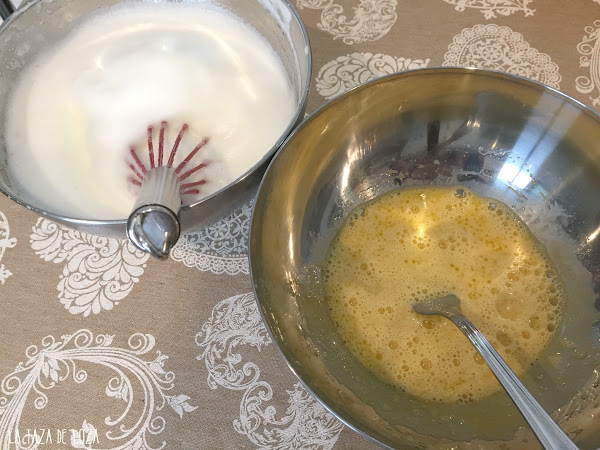 Se separan las yemas de las claras, en dos bols diferentes. Las claras se baten a punto de nieve con una pizca de sal. Cuando ya están blancas se añade la mitad de la cantidad del azúcar. Se sigue batiendo hasta que esté casi como un merengue.