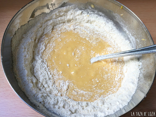 Se mezcla bien mientras va cayendo la harina sobre los líquidos y cuando ya está incorporada toda la harina, se añaden las claras mezclando con una lengua de repostería y haciendo movimientos envolventes para que no se bajen las claras.