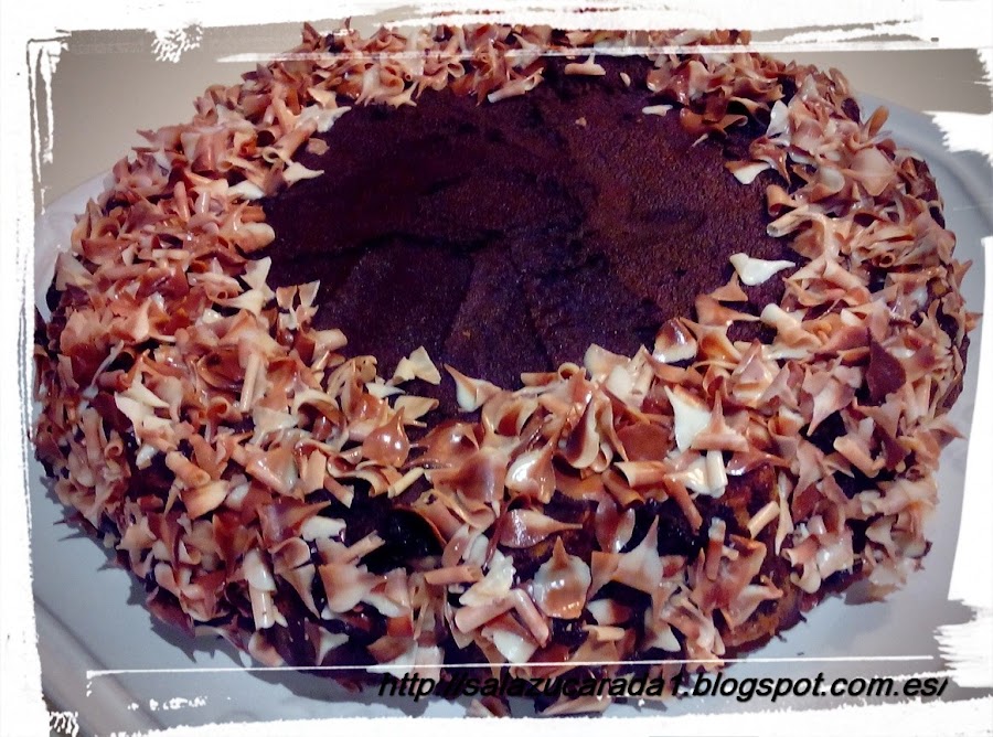 Como se hace :Ponemos el horno a calentar a 180ºC. Preparamos la crema de chocolate pues habrá que dejarla enfriar una hora por lo menos : derretimos el chocolate junto con la nata (crema de leche) y la mantequilla en el micro ondas a tandas de 30 segundos para que no se nos queme y dejamos enfriar . Empezamos el bizcocho batiendo los huevos con el azúcar hasta que estén espumosos, entonces empezamos a añadir en forma de hilo y sin dejar de batir, primero la leche y a continuación el aceite. Tamizamos sobre la mezcla la levadura junto con la harina, con una espátula de silicona lo mezclamos con movimientos envolventes para que no se nos baje la mezcla de huevos , una vez tengamos la harina integrada, añadimos la harina de almendra siguiendo el mismo procedimiento, con movimientos envolventes . Añadimos ahora la pizca de sal y la canela y removemos bien.