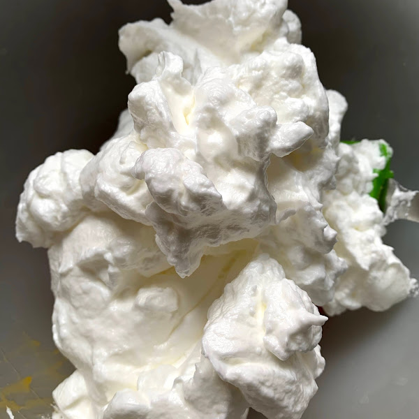 2. Batimos las claras con una pizca de sal. Cuando estén blancas, añadimos la mitad del azúcar y seguimos batiendo hasta el punto de nieve, tipo un merengue como en la foto. Reservamos.