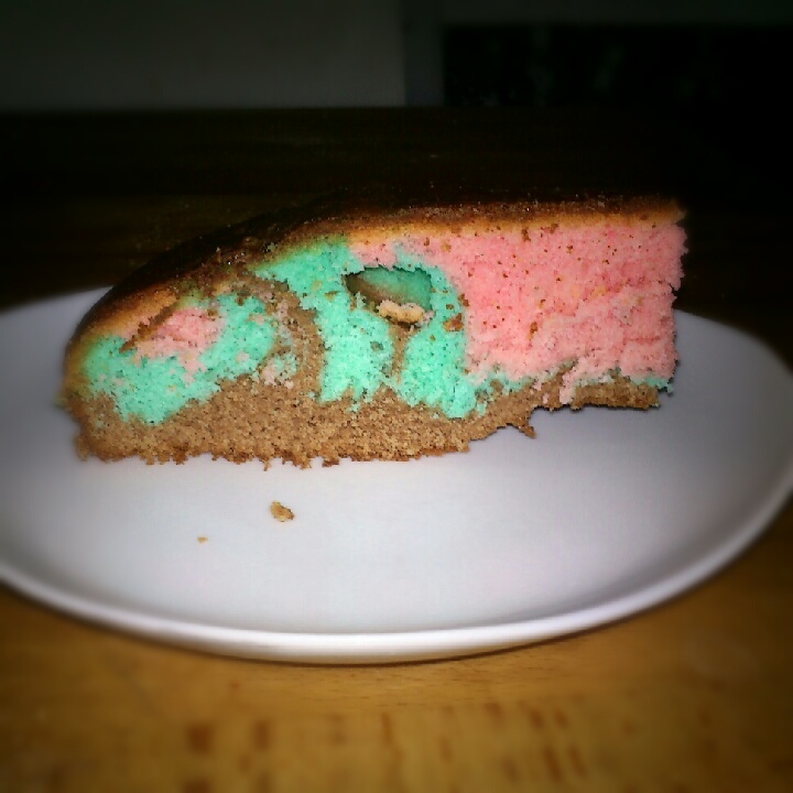 Para hacer capas de diferentes colores, yo he pesado la masa total y la he dividido entre 3 así mas o menos las capas son del mismo grosor.Una de las capas la hemos echo de colacao, hemos echado unas 5 cucharadas, otra hemos echado tinte azul, y otra tinte rosa, y cuando ya tenemos las tres masas de colores, hemos echado primero la de colacao, luego la de tinte azul y después la de tinte rosa.