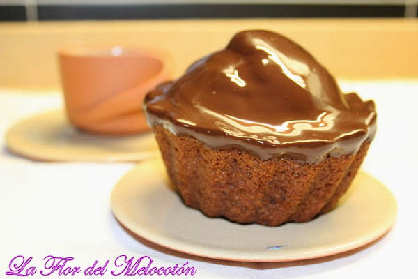 La idea inicial fue la de hacer un bizcocho, pero como el molde quedaba muy lleno, decidí repartirlo en dos, y así salió esta magdalena gigante. La guinda fue ponerle el chocolate por encima... mmmm! ahora mismo le hincaba el diente!