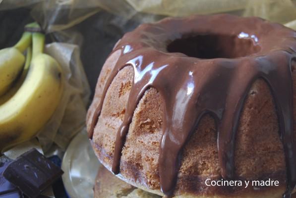 Una receta dulce, un bundt cake de plátano, es decir un rico bizcocho de plátano en un molde especial llamado bundt cake y el toque para que todavía este más delicioso es el de un sencillo glaseado de chocolate.