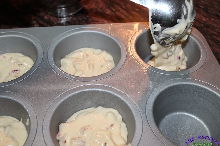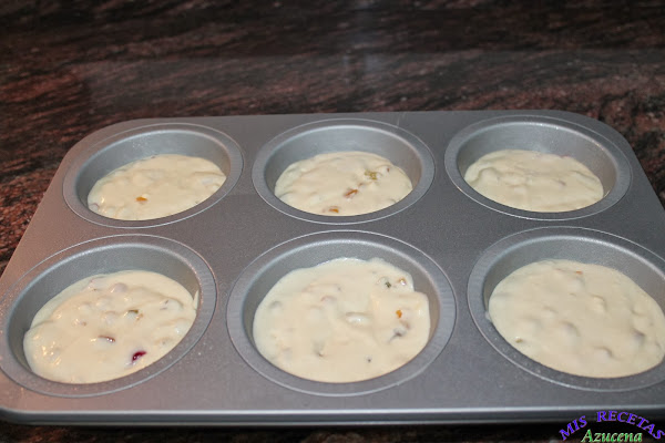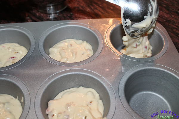 Cogemos un cucharon y rellenaremos cada molde un poco más de tres cuartas partes de su capacidad, metemos al horno y lo dejaremos entre 50 y 55 minutos, una vez que pase este tiempo para comprobar que están hechas pinchamos con un palillo en el centro de un bizcocho y si sale limpio está listo, de lo contrario déjalo unos minutos más.