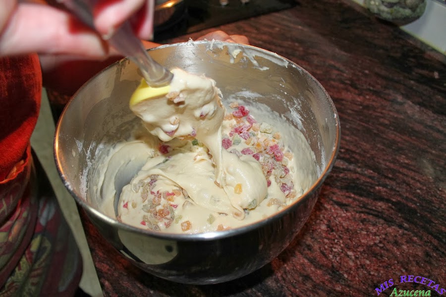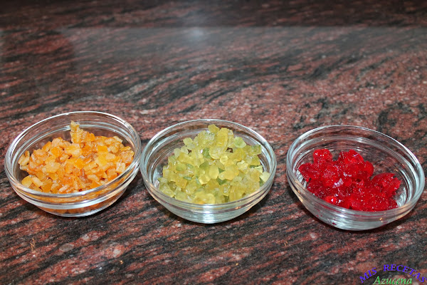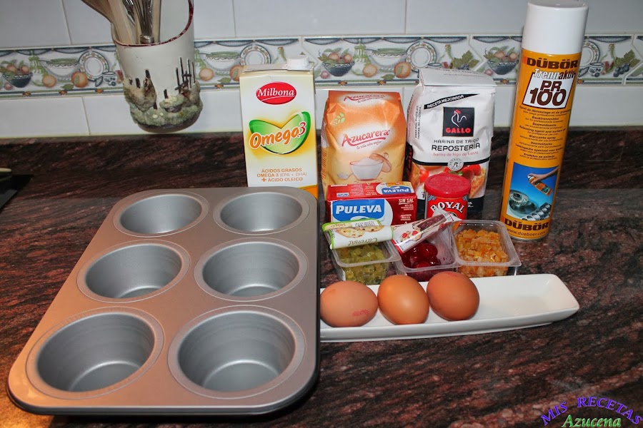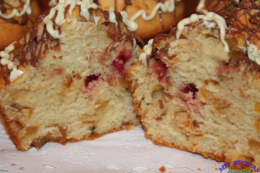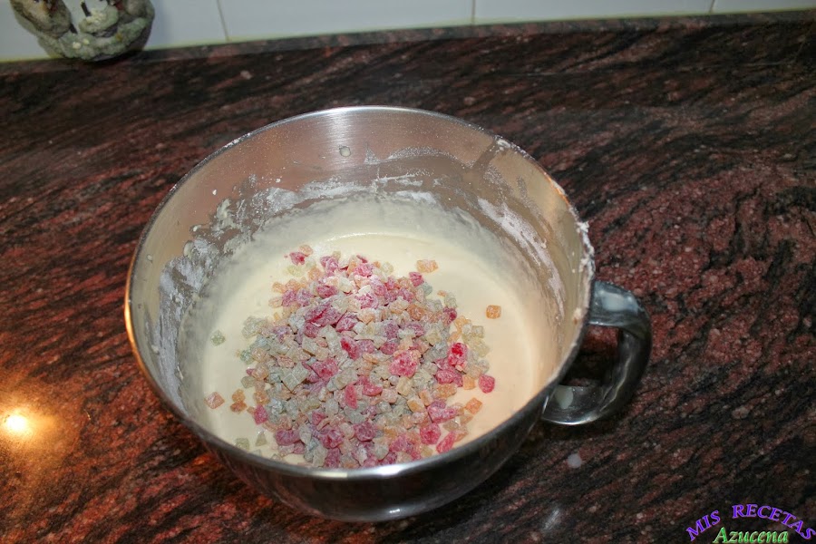 Bueno esta semana ha estado muy bien, han sido recetas sencillas, con poco trabajo y con pocos ingredientes, quizás la más cargada de ingredientes sea la de hoy, pero no es complicada de hacer. Estos bizcochos vienen muy bien pera desayunos y meriendas, las frutas confitadas le dan un sabor muy bueno y gusta encontrarte los trocitos de fruta cuando los comes.