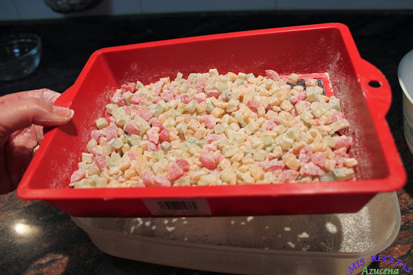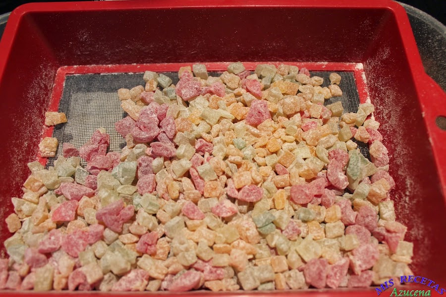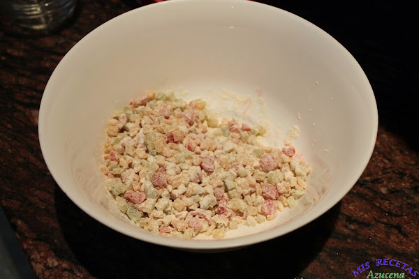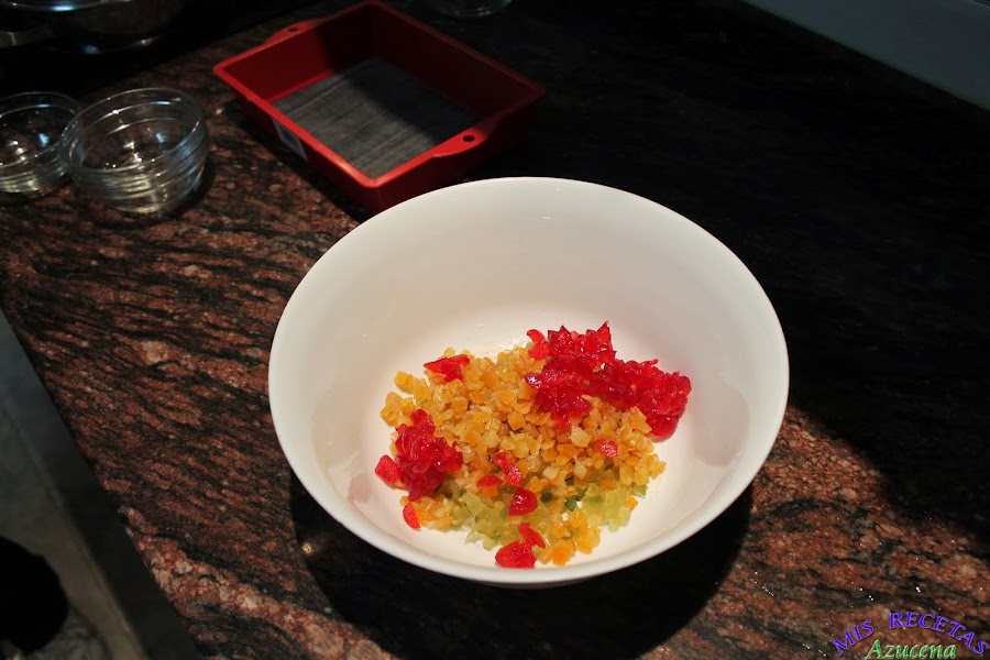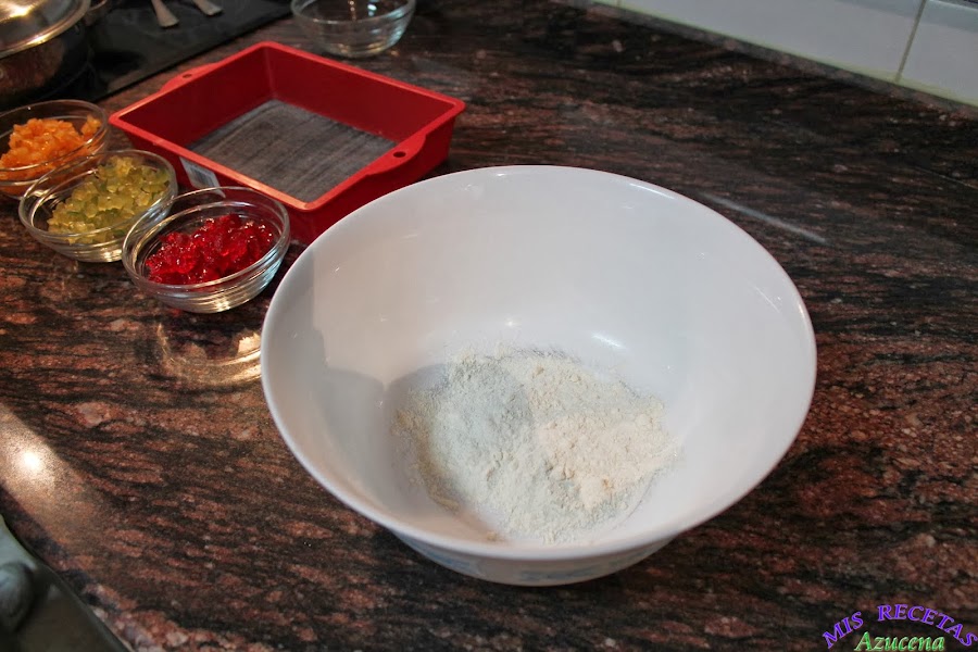 Ahora necesitaremos un bol en el que tendremos un poco de harina, de esta no te pongo cantidad ninguna, es para la fruta confitada.