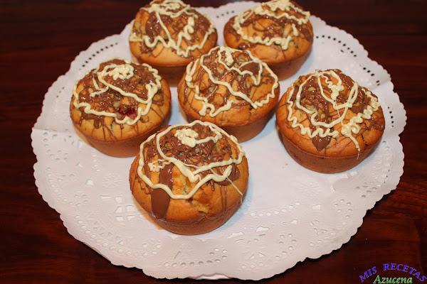 Una vez que los tengamos desmoldados, los pondremos en una bandeja y derretiremos un poco de cada chocolate y con ayuda de una manga le pondremos un poco de cada chocolate a cada bizcocho de la forma que más te guste, también os pongo azúcar glas para espolvorear por encima que le va muy bien, para quien no quiera ponerle chocolate.