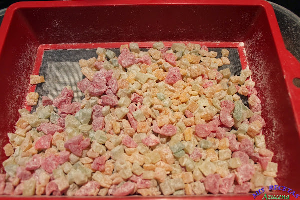 Yo he utilizado tres tipos de frutas, cerezas, manzana y naranja, las ponemos todas en el bol donde tenemos la harina y mezclaremos bien para que cojan harina, una vez estén todas sueltas con ayuda de un tamizador las tamizaremos para quitarle toda la harina que podamos, esto lo hacemos para que a la hora de añadir las frutas a la masa y hornearlas no se nos bajen todas a la base del bizcocho.