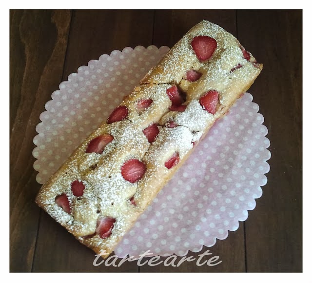 En el blog "Tartearte" nos propone un Bizcocho de fresas muy sencillo y rápido de hacer y con una presentación preciosa y original.