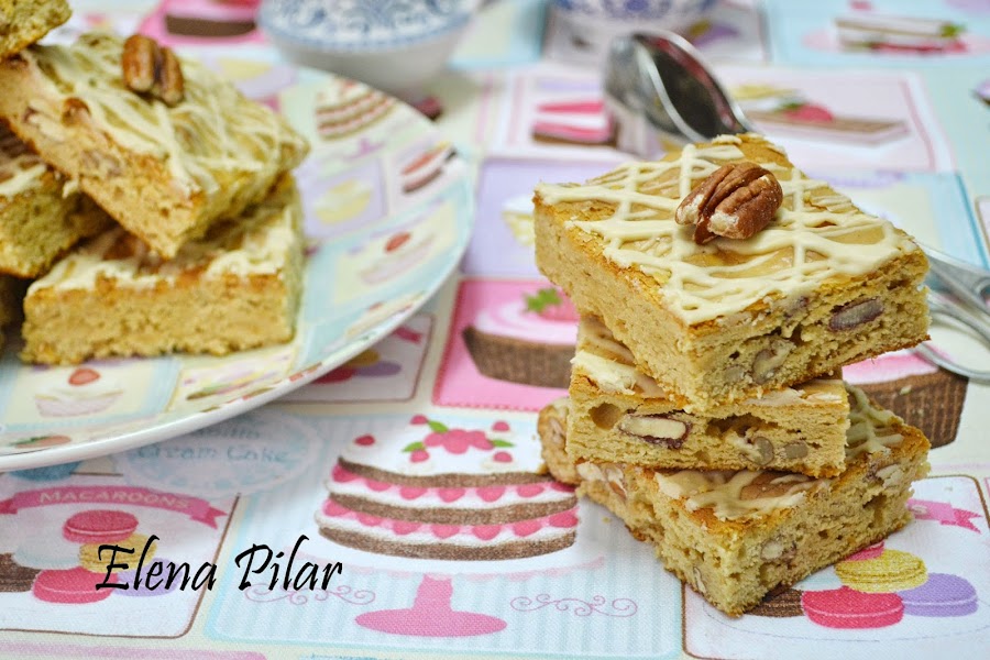 Y para terminar, el no tan conocido Blondie (pincha en el nombre para ver la receta completa).que realmente es lo mismo que el brownie, pero con chocolate blanco. Mi recetario por Elena Pilar nos enséña como hacer esta delicia, que además tiene un toque especial gracias a las pecanas y el glaseado de Baileys que tiene: