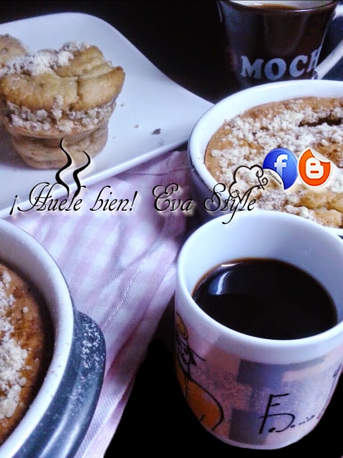 4.- Preparamos la cobertura de los bizcochos. Mezclamos todos los ingredientes hasta obtener una pasta desmigada. Distribuimos la pasta sobre los masa que está en los moldes. Horneamos 30 minutos.