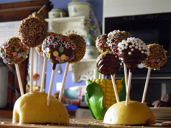 Moja la punta de un palito de piruleta en chocolate fundido, introfuce hasta la mitad de la bola y moja la piruleta en el chocolate de cobertura. deja que gotee lo necesario y despues clávalo sobre una superficie de corcho (Yo usé una manzana). antes de que se sequen decoralas al gusto para que chocolate fije la decoración. Deja secar y enfriar y listo!