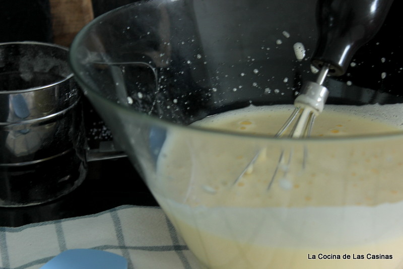 Pellizco de SalBate los huevos con el azúcar hasta que la crema triplique su volumen, yo lo he hecho con la batidora. Incorporas la harina tamizada. Mezcla con cuidado con la espátula para que no se te baje la crema.