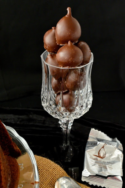 Aparece en juego otro de los rellenos del bundt cake. ¡¿Qué delicia me acaban de traer?! ¡¡¡Unos Rabitos Royale!!! ¿Sabéis lo que son? Seguro que sí, pero por si acaso. Los Rabitos Royale son bombones de higo. La primera vez que los probé fue en una visita a la provincia de Cáceres. Son una delicatessen y me encantaron. Están hechos con una variedad de higo propia del lugar, la llamada "calabacita" que se caracteriza por su temprana madurez, melosidad y dulzura. Los bombones de higo están rellenos de crema de trufa, en este caso al brandy, y cubiertos con otra capa de chocolate. Son una delicia al paladar y me dieron una idea estupenda. Meterlos dentro de mi merengue para que fuera una sorpresa blanca y negra.