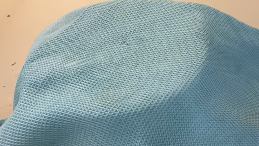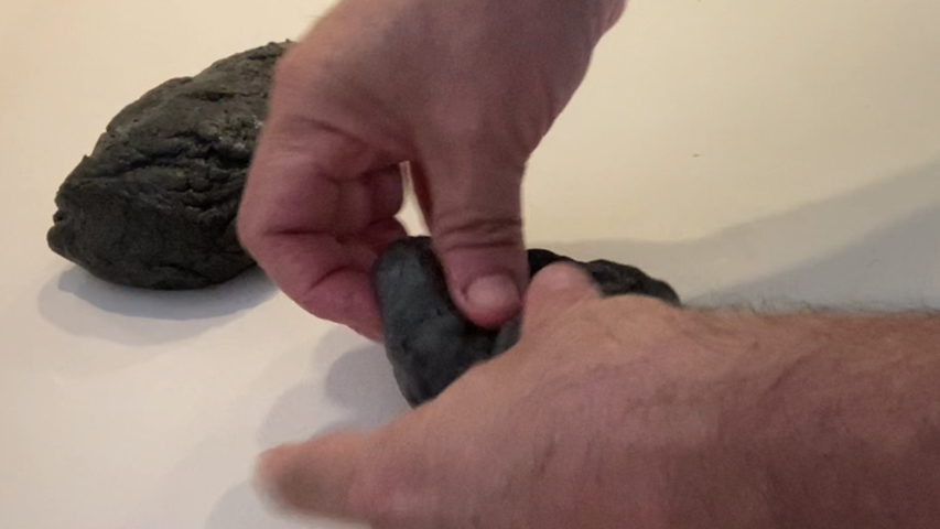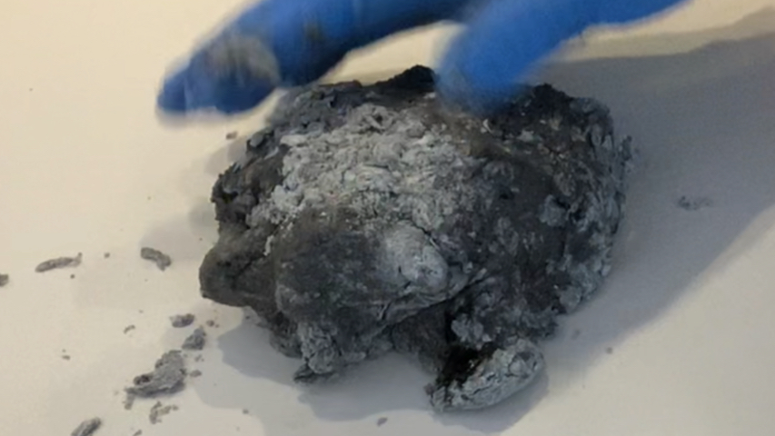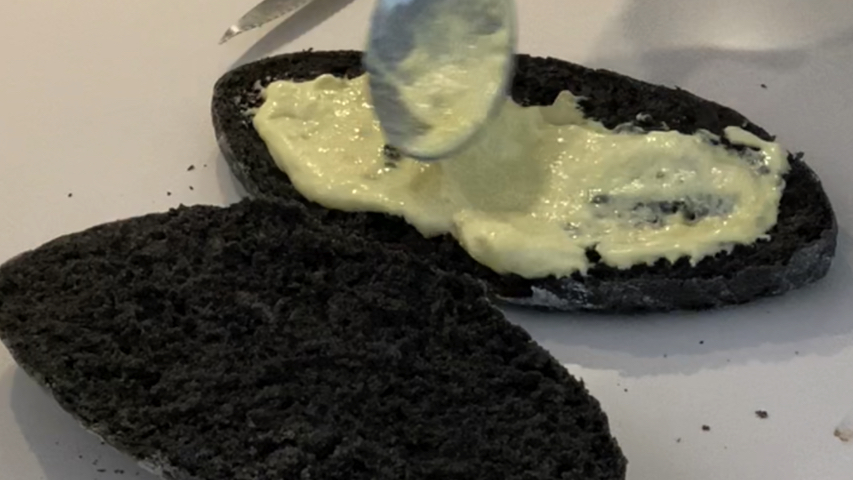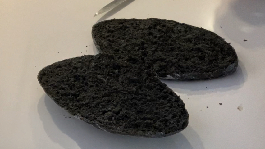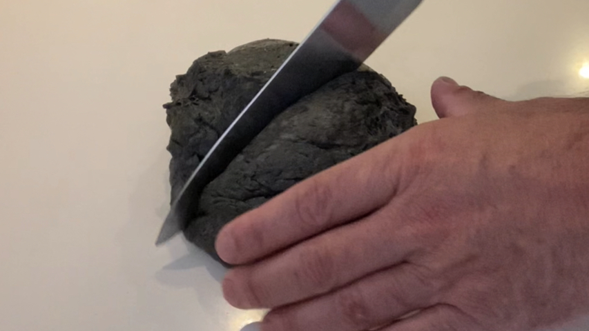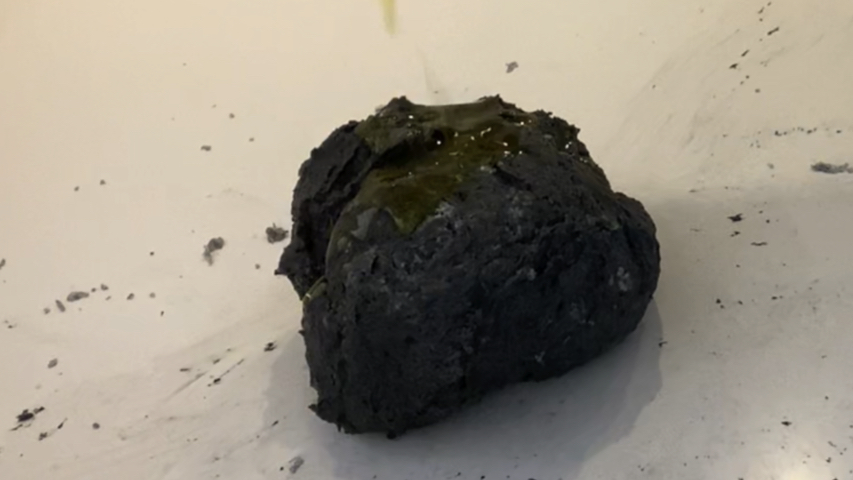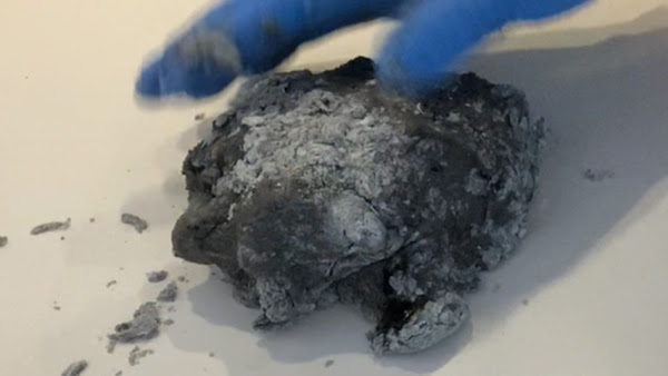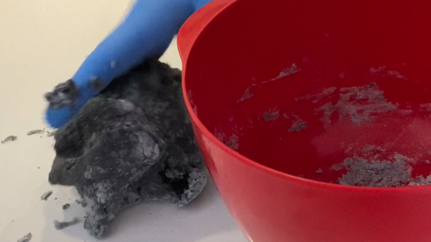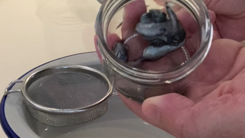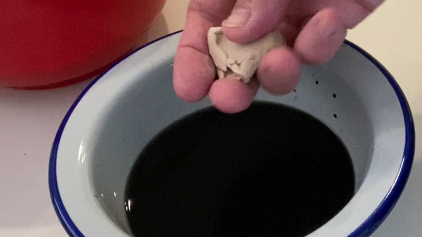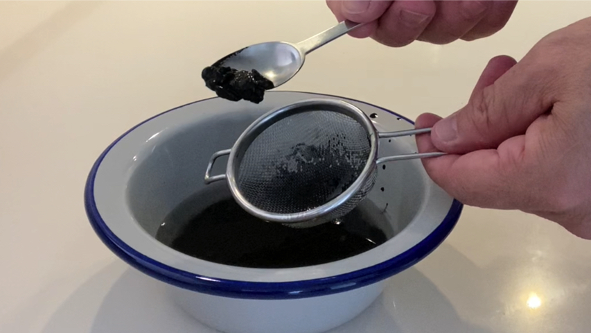 Rompe las bosas de tinta sobre el agua utilizando un colador para que el agua se tiña de negro.