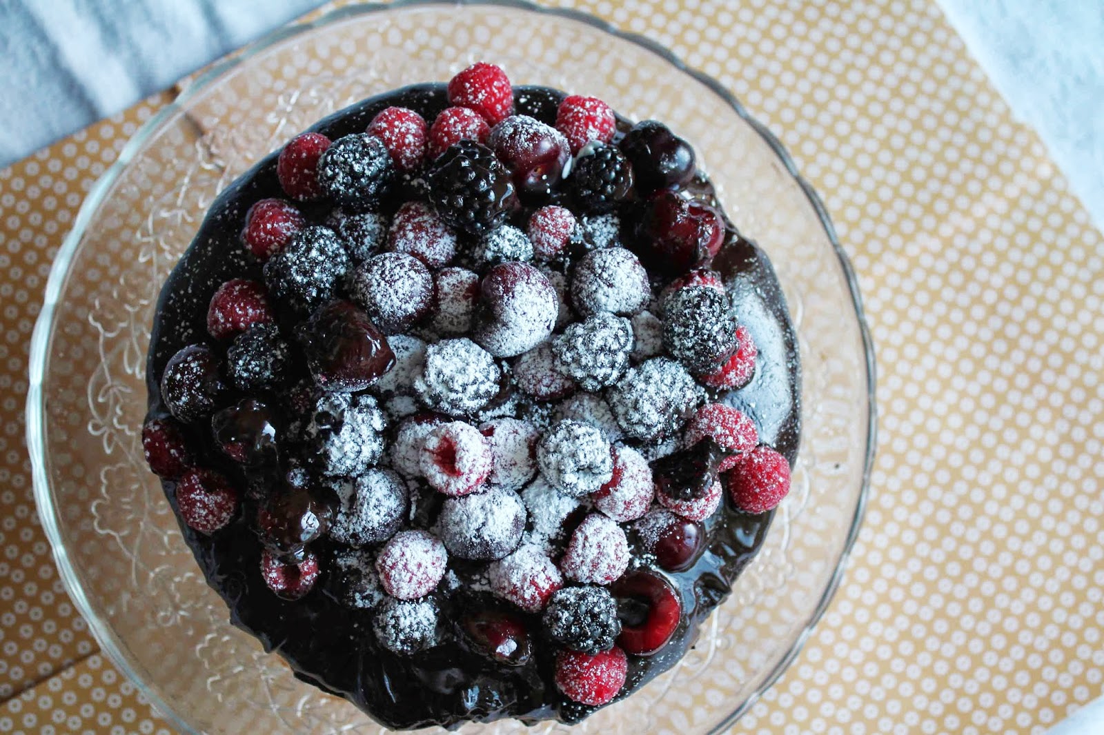 12. Disponemos la segunda capa de bizcocho y sobre ella el ganache de chocolate. Y a continuación decoramos con las frutas a nuestro gusto y espolvoreamos azúcar glasé.