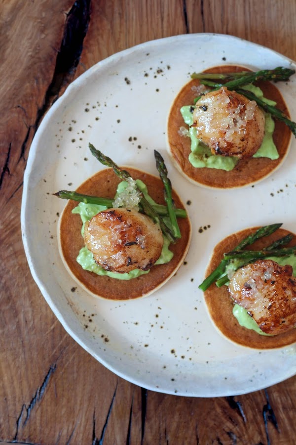 Para montar el plato disponemos los blinis salados en la base, sobre éste colocamos una cucharada de mayonesa de aguacate y encima las vieras marcadas. Colocamos las puntas de espárrago en un lateral y terminamos el plato con el caviar cítrico.