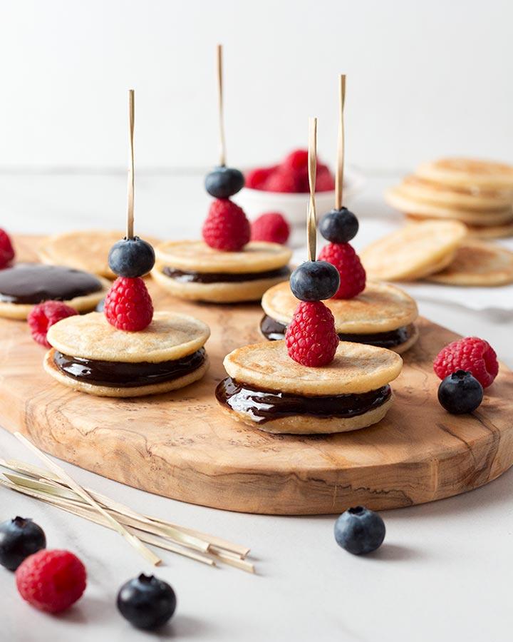 Rellena los blinis con la crema de chocolate, haz banderillas de fruta usando los palillos y luego colócalas sobre los blinis rellenos.