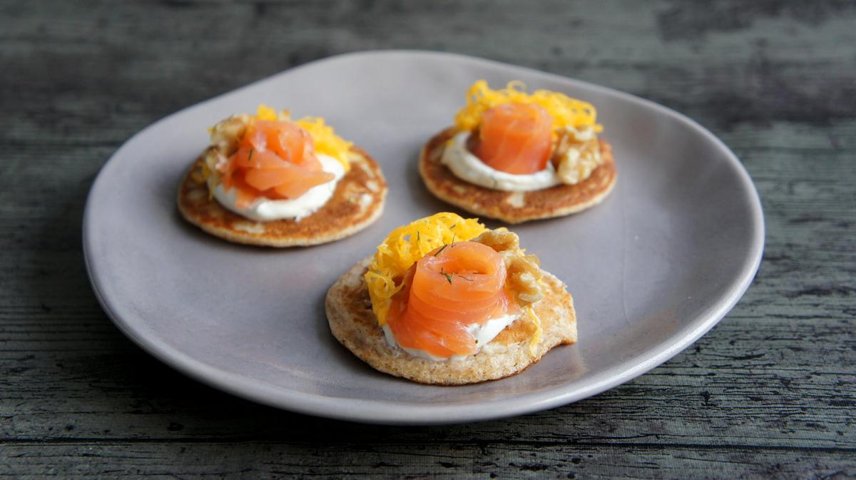 Para el relleno, mezclamos el queso crema con el yogur, el limón y las especias. Untamos nuestros blinis con esta crema y encima colocamos un rollito de salmón ahumado, un poco de huevo hilado y nueces picadas.