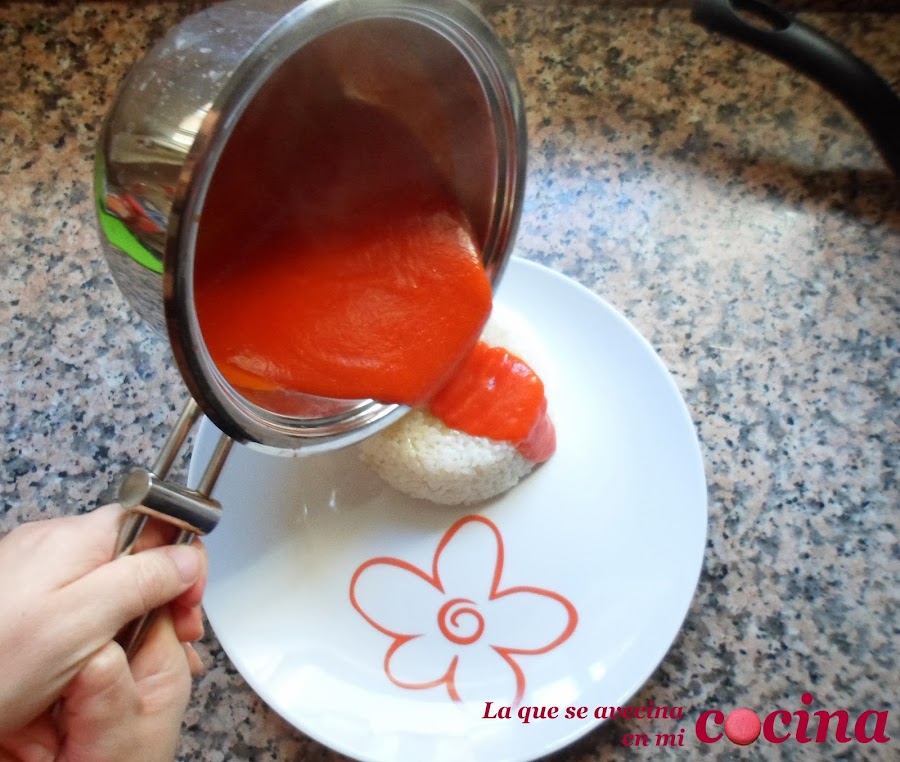 Echamos el tomate sobre el arroz.