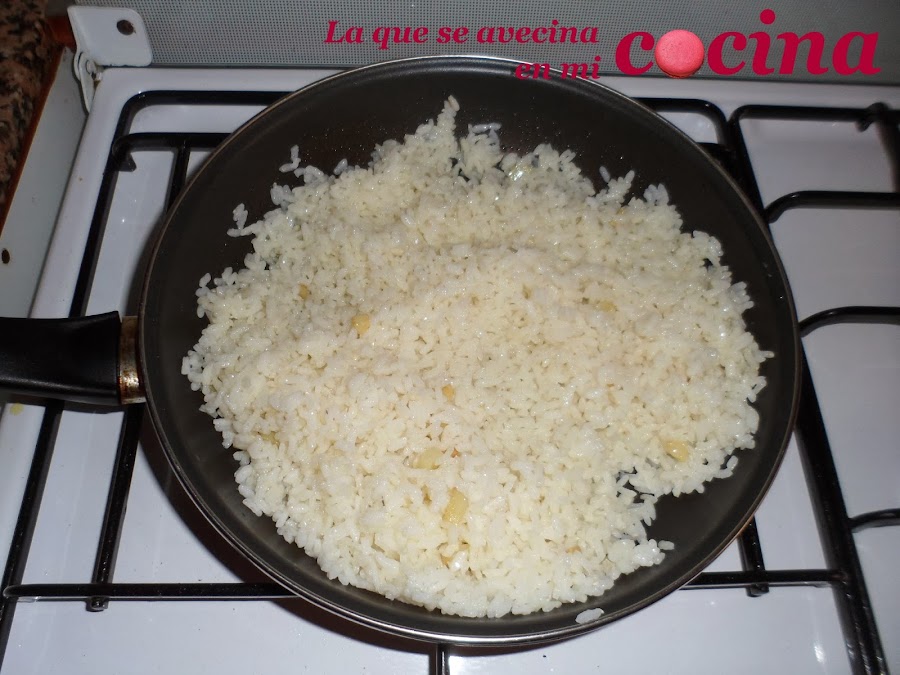 Cortamos los ajos. Refreimos los ajos y añadimos el arroz ya cocido.