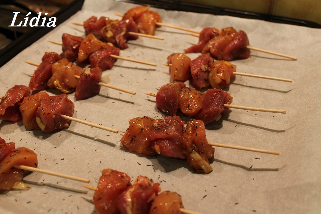 Cuando ya esté la carne macerada, la pincharemos en un palo , cogeremos una bandeja , le pondremos papel de horno y dispondremos encima las brochetas.