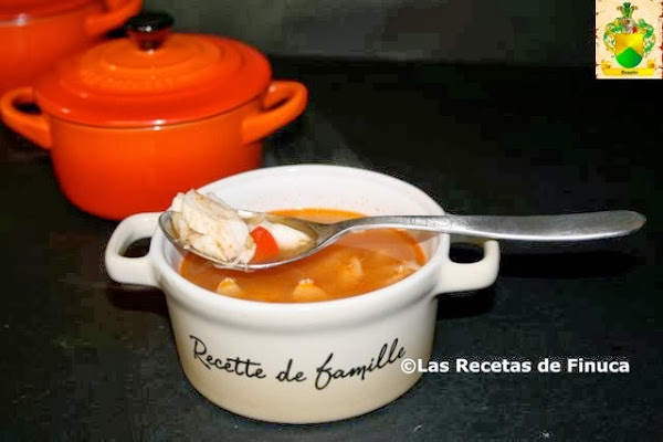 Ponemos los pimientos choriceros en un recipiente con agua templada a hidratar. Limpiamos y lavamos bien todas las verduras. En una cazuela con 1 litros y medio de agua ponemos 1 zanahoria, un puerro y 4 dientes de ajo. Cuando empiece a hervir, dejamos que se haga media hora. Pasado este tiempo añadimos la cabeza de rape y el cabracho, salamos y dejamos que se haga media hora. Colamos y ponemos el caldo resultante en otra cazuela. Dejamos que temple el pescado. En una sartén ponemos a calentar un poco de aceite. Picamos la cebolla, lavamos y picamos el pimiento. Lo ponemos en la sartén, salamos ligeramente y dejamos que se haga a fuego medio-bajo. Mientras, sacamos la carne de los pimientos choriceros y lo añadimos al refrito. Revolvemos de vez en cuando. Cuando la cebolla esté bien hecha, ponemos todo en el vaso de la batidora, añadimos un poco del caldo y trituramos. Este refrito lo echamos sobre el caldo que tenemos reservado en una cazuela. Desmenuzamos el pescado, cuidando de que no queden espinas y añadimos al caldo. Con estos días de frío tendremos una sopa de pescado que nos entonará cuando lleguemos de trabajar.