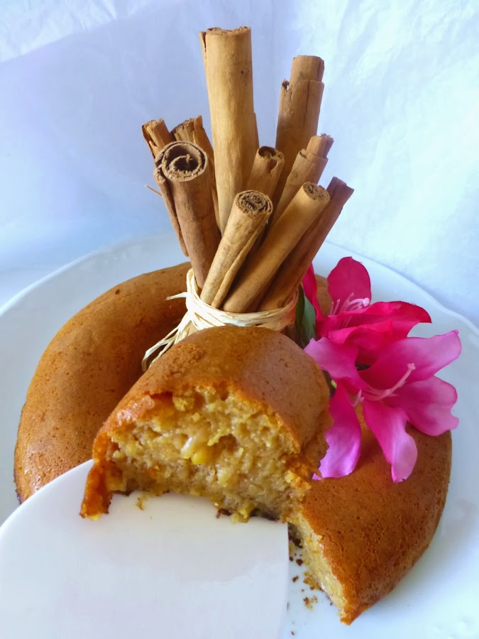 Vertemos nuestra preparación en el molde elegido, en mi caso uno de corona antiadherente, por eso no lo he untado ni de aceite ni de mantequilla y no se pegó. Cocemos durante 25 ó 30 minutos. Como sugerencia, te diré que alguna vez le he añadido una cucharada de coco rallado y no le va mal... para nada.