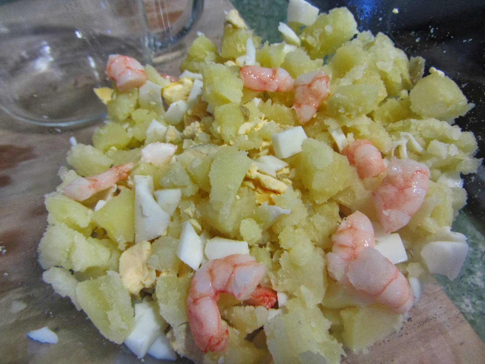 Y, por favor, sed buenos, y no os riáis mucho de mi ?arte decorador?, aunque en casa ha gustado, jajaja. INGREDIENTES: (Para 4 personas) 3-4 patatas medianas Unos 15 langostinos 1 huevo duro para la ensalada, y al menos 2 para decorar. Sal, pimienta, y mayonesa al gusto. Aceitunas para decorar. PREPARACIÓN: En primer lugar, coceremos las patatas (con piel) y los huevos, por un lado,y los langostinos por otro. Podemos cocer primero los langostinos, y después pelarlos, cocer durante unos minutos las cáscaras y cabezas, colar el agua, y aprovecharla para cocer las patatas, así estarán más sabrosas. Una vez que esté todo cocido, troceamos las patatas, cortamos los langostinos en dos trozos, y picamos uno de los huevos, reservando los otros para decorar. Colocamos todos los ingredientes en un bol con forma de media esfera, y salpimentamos (probamos antes el punto de sal). (Nota: si tenemos miedo de que no desmolde bien, forramos el bol con papel film, así nos será más fácil desmoldar). Añadimos la mayonesa, en la cantidad que nos guste (mejor no excedernos demasiado, para que no quede muy pesada), y mezclamos bien.