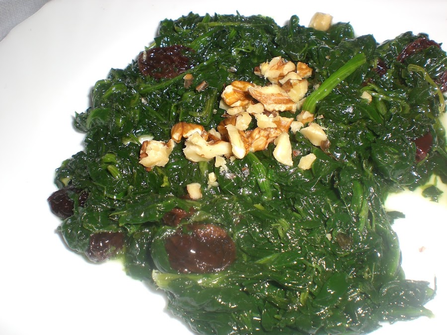 Nota: El plato original lleva pasas en vez de nueces, pero no tenía y me las apañe así. Debo decir que con nueces no tiene nada que enviar a los piñones ;)