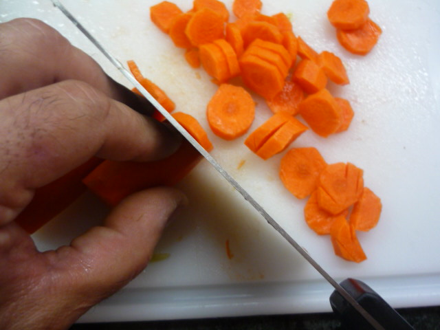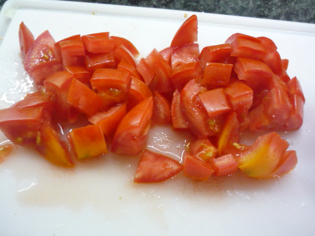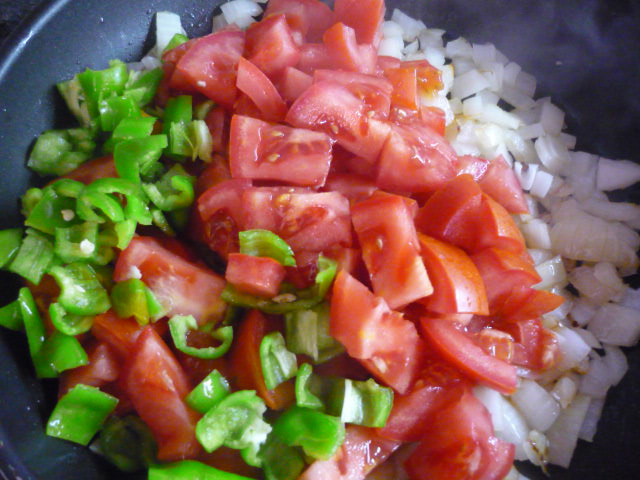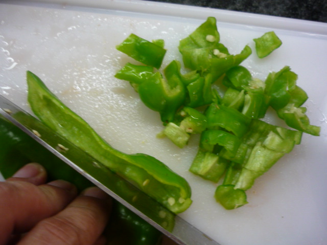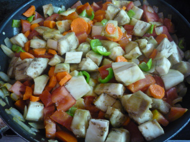 3.- Mientras cortamos toda la verdura en dados y la rehogamos con el resto del aceite.