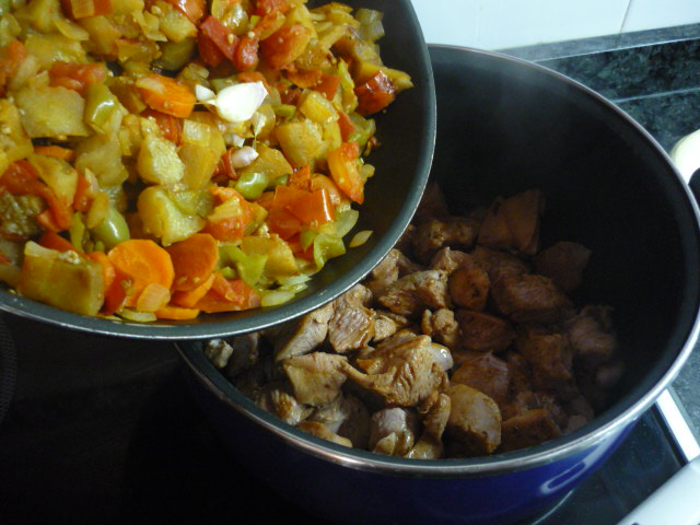 4.- Pasamos el pavo a un cacerola cuando este sellado y le agregamos las verduras pochaditas.