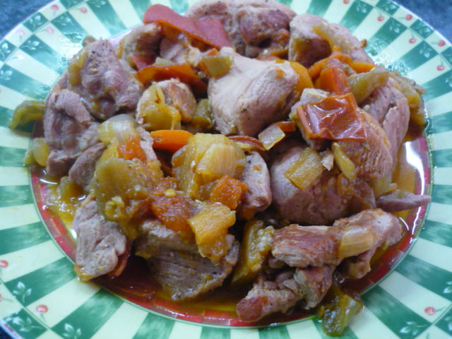 Como llevo dos días de recetas sin grasas y ahora es muy popular la frase en el deporte español "no hay dos sin tres", hoy presento la tercera, otra versión de estofado de pavo, muy bajo en calorías, acompañado de verduritas de la huerta.