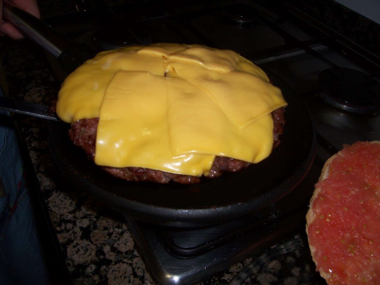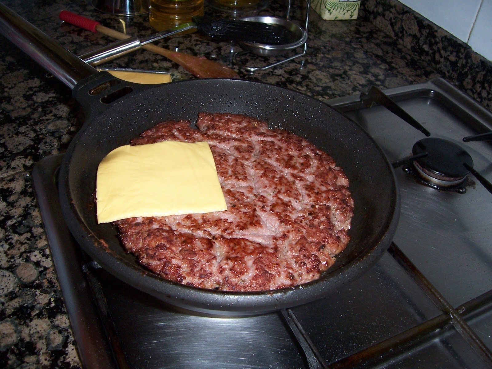 Ponemos la carne en una sartén antiadherente sin nada de aceite (la carne ya soltará su grasa) y la extendemos bien según el tamaño del bollo, cuando esté por un lado le damos la vuelta y la hacemos bien por los dos lados, en el último momento cuando le falten un par de minutos añadimos las lonchas de queso y dejamos un par de minutos más a fuego lento para que el queso se derrita.