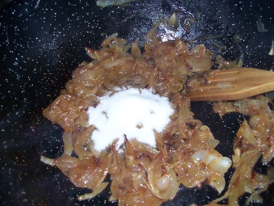 En primer lugar caramelizamos la cebolla, la cortamos en tiras y la ponemos a pochar con un chorrito de agua durante unos 20 ó 30 minutos hasta que esté dorada y suelte casi toda el agua, en ese momento añadimos la cucharada de azúcar dejamos que se caramelice durante un par de minutos y añadimos la cucharada de vinagre para evitar que el azúcar se cristalice, apartamos.