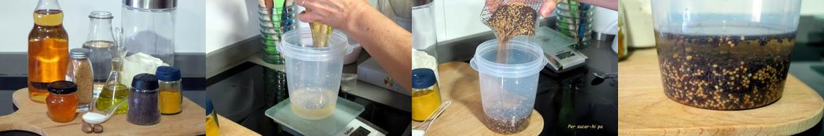 El día anterior colocar en un recipiente el vinagre de sidra, el agua y las semillas de mostaza, de manera que queden en remojo y se vayan hidratando. Cuando vayamos a utilizarlas habrán absorbido la mayor parte del líquido.