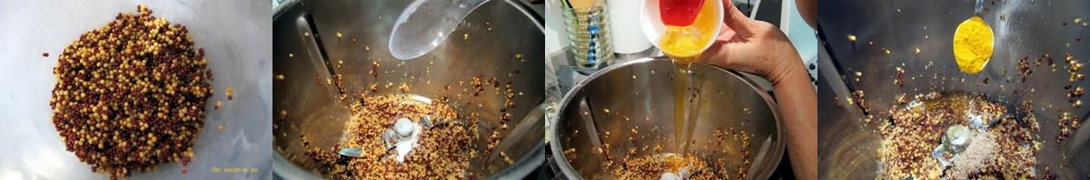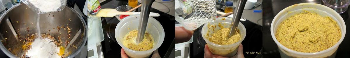En el vaso de la batidora colocar las semillas de mostaza y el resto de los ingredientes excepto el aceite. Triturar hasta obtener una mezcla homogénea. Si no nos pasamos, nos quedará una bonita textura de mostaza a l"ancienne con algunas semillas casi enteras. La cúrcuma ayuda a que la mezcla adquiera esa tonalidad amarillenta característica de la mostaza.