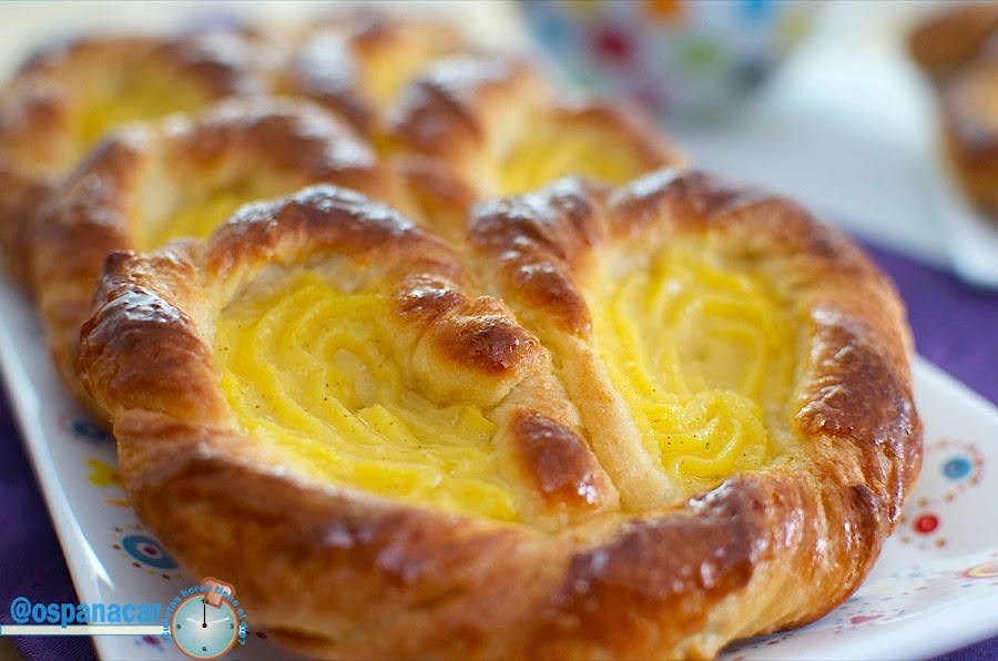 Estiramos la masa hasta formar un rectángulo. Cortamos tiras a la larga de unos dos dedos de ancho. Yo he utilizado una tablilla de madera y un cortapizzas. Cogemos la tira por cada uno de los extremos y enroscamos en sentido a las agujas del reloj con el extremo derecho y a la inversa en el izquierdo. Le damos la forma girando los extremos hacia adentro y colocamos en la bandeja del horno (que tendrá un papel de horno) y dejamos el sitio para colocar la crema.