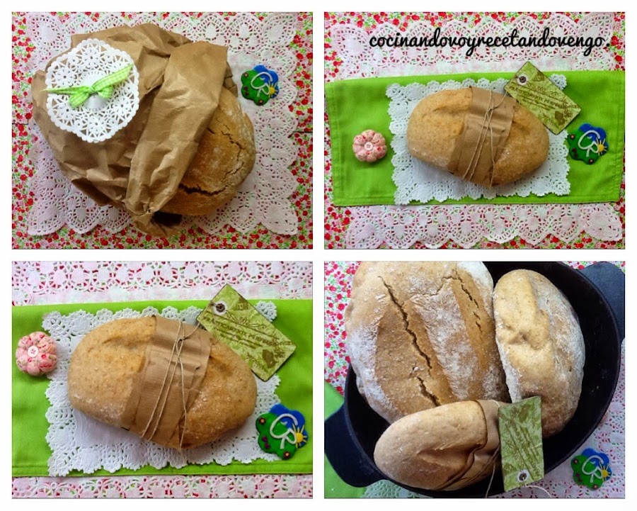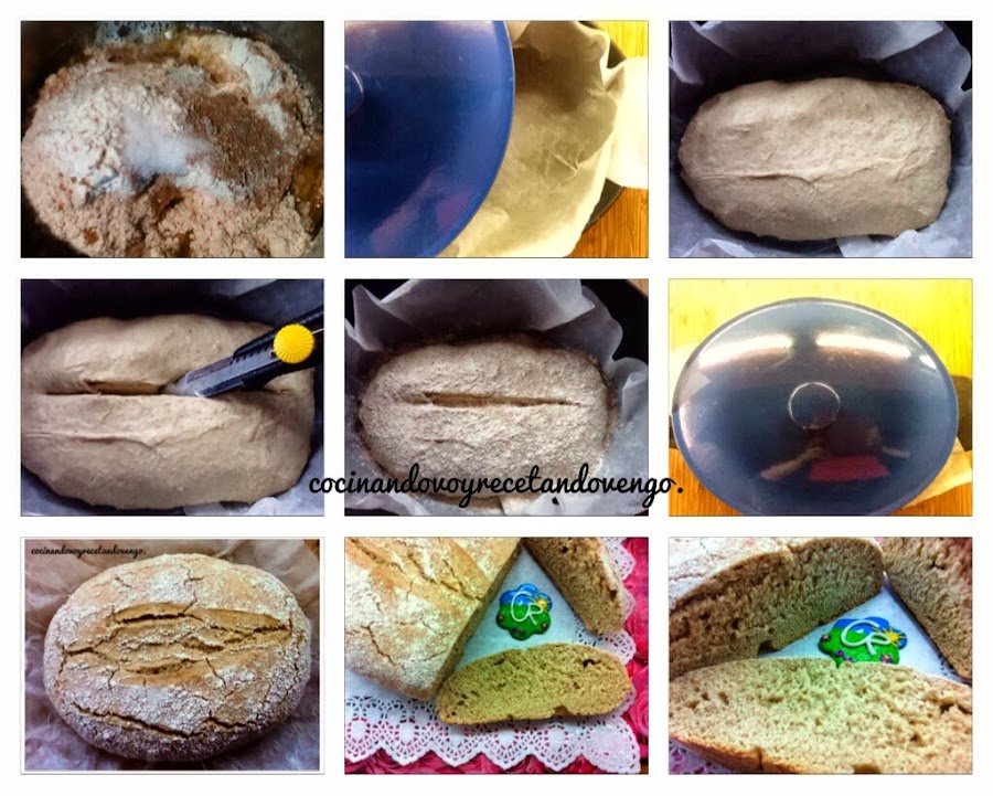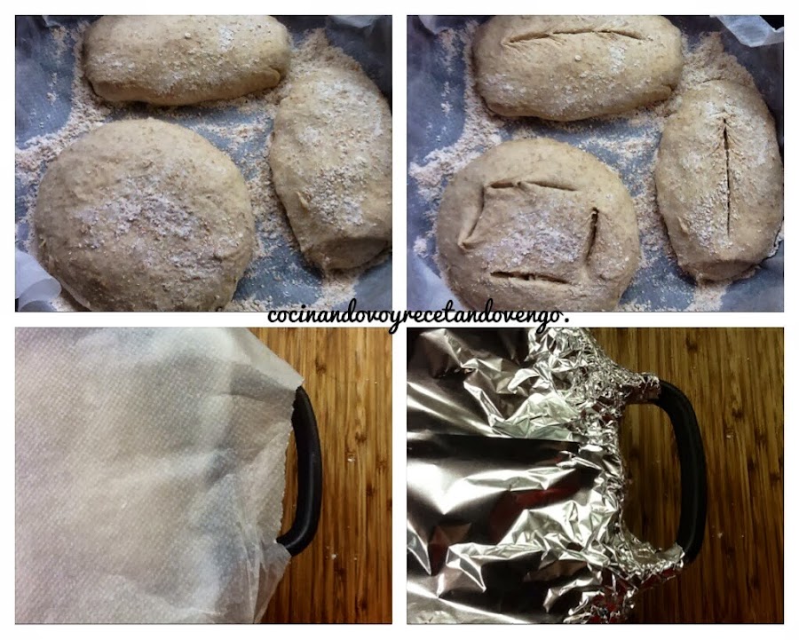 NOTA: Es importante tener un recipiente apto para horno con tapadera, en mi caso usé mi olla cocotte (de hierro fundido vitrificado) pero pueden usarse pirex de cristal con tapadera...he experimentado en una tartera de horno y sobre el pan poner un papel de horno primero y posteriormente papel de plata y cerrandolo bien, puede hacer las funciones de tapadera, por si no teneis recipiente con tapa y no quereis comprar mas cacharros...pues os tengo que decir que funciona, podeis ver más abajo las fotos que lo demuestran...hice 4 bollos y quedaron fenomenal.