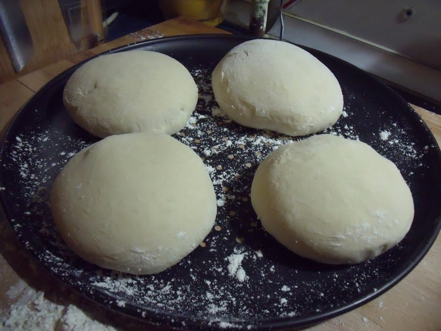 Una vez que termine la máquina, tarda una hora y media, tomamos la masa y hacemos pequeños bollitos. Para que no se nos pegue la masa a las manos ni a la zona de trabajo espolvoremos harina y nos untamos las manos con harina. Os aconsejo hacer los bollitos aplanados porque luego creceran hacia arriba y se os quedará mucho pan para las hamburguesas.