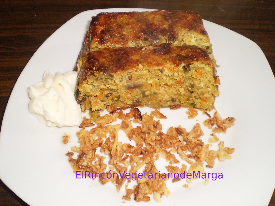 Calentamos agua en el microondas y cuando esté tibia le añadimos la soja texturizada, en este momento, la soja se hidratará y quedará como carne picada. Dejarla hidratar unos 3 minutos. Pelar las zanahorias, los puerros y la cebolla, picarlo todo muy finito y pocharlo junto a un chorro de vino blanco unos 6 minutos, o hasta que queden los vegetales blanditos y con color. Añadimos sal, una cucharadita de café de cúrcuma (para dar color y sabor) y una pizca de pimienta negra, seguidamente incorporamos la soja texturizada y la dejamos dorar unos dos minutos, pasado ese tiempo, apartamos del fuego. Batimos los huevos y le añadimos la nata (crema de leche), mezclamos bien ambos ingredientes. Incorporamos el sofrito de la sartén en el bol con los huevos y la nata (crema de leche) y lo mezclamos bien. Precalentamos el horno. Añadimos la mezcla en un molde de puddin de silicona (mucho mejor a la hora de desmoldar) y lo horneamos 15 minutos a 175ºc.