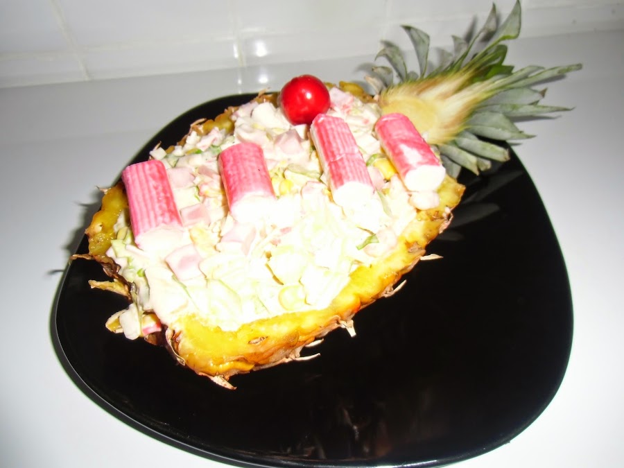 Rellenamos la piña con la mezcla y decoramos al gusto
