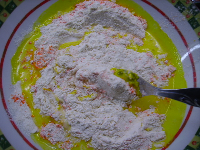 3.- Mientras preparamos el rebozado mezclando la harina, con el gasificante, el colorante y añadimos leche hasta obtener una pasta densa y homogénea.