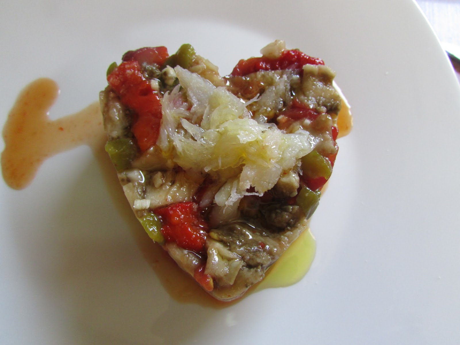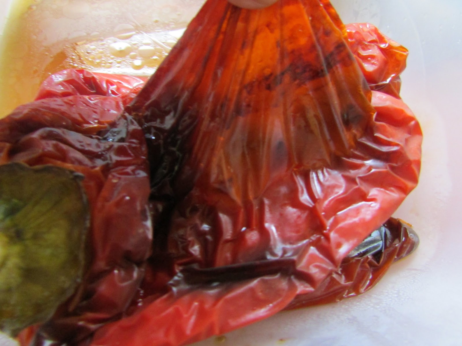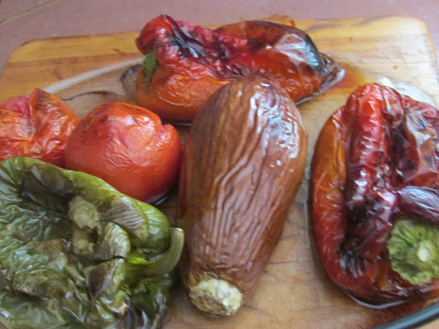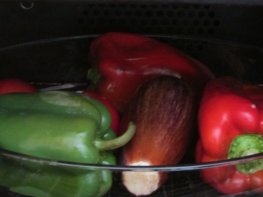 cuando veamos que ya están asadas, los pimientos y los tomates se ve fácil, la berenjena la podemos pinchar para comprobarlo, apagamos el horno y esperamos a que se enfríen para poder pelarlas sin quemarnos.
