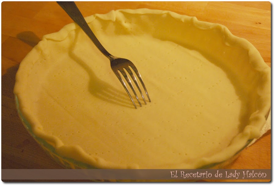Engrasa el molde con un poco de margarina o aceite para que la masa no se pegue mucho y puedas servirla sin problemas. Extiende la masa sobre el molde, pégala a los bordes con cuidado y pínchala con la ayuda de un tenedor para que no se hinche. Si te sobra masa el borde superior puedes doblarla hacia dentro como hice yo, recortarla o adornarla como más te guste :).
